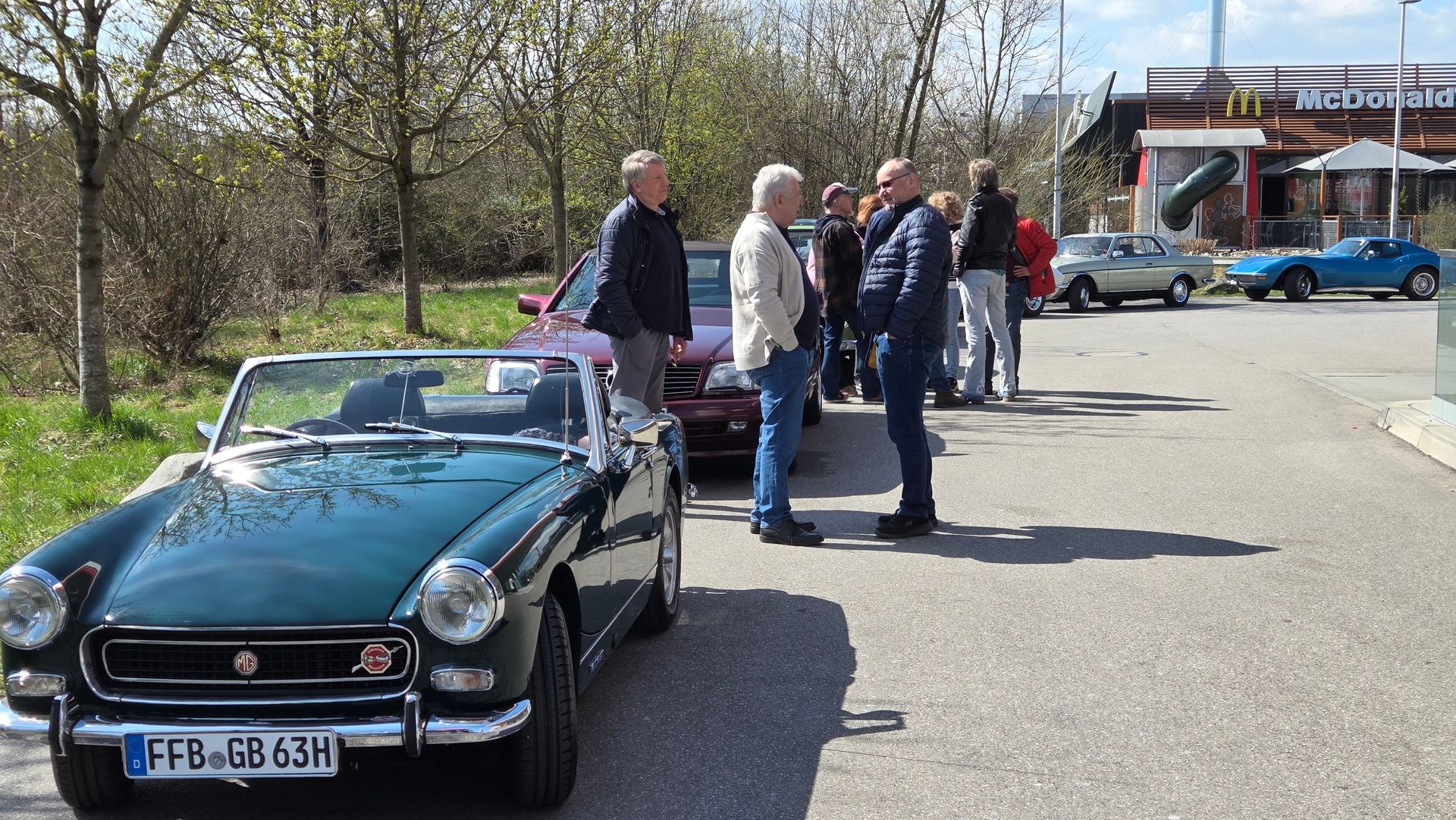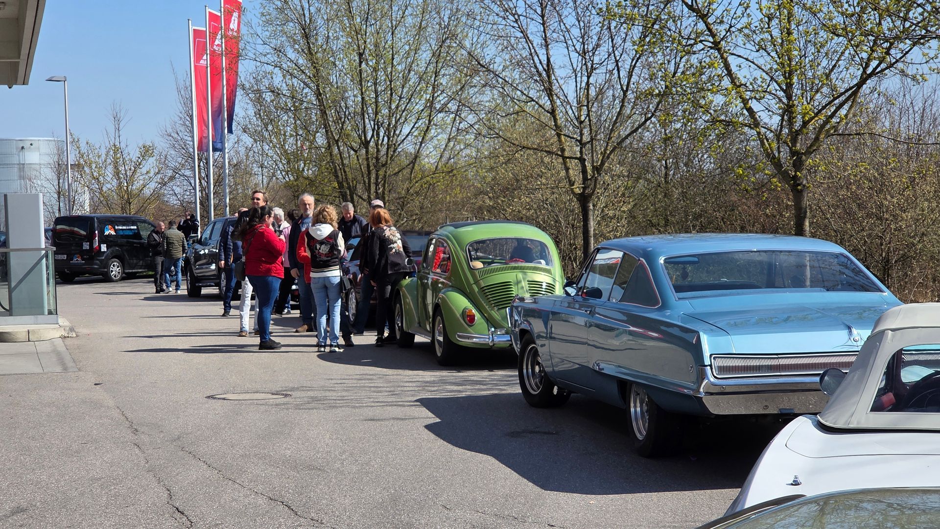 Und so trafen wir uns um 12 Uhr an einem unserer Standard-Treffpunkte, der Allguth-Tankstelle in Geiselbullach, zur gemeinsamen Anfahrt. Immerhin mit 10 Fahrzeugen kamen wir um 13 Uhr als eine der ersten Gruppen in Mering an und konnten uns gute Plätze sichern. Das Wetter spielte mit: Zwar war es mit ca. 13 Grad noch zu kalt für die meisten Cabrio-Fahrer um offen zu fahren, aber bei viel Sonne konnten wir unsere Reiberdatschis draußen genießen.